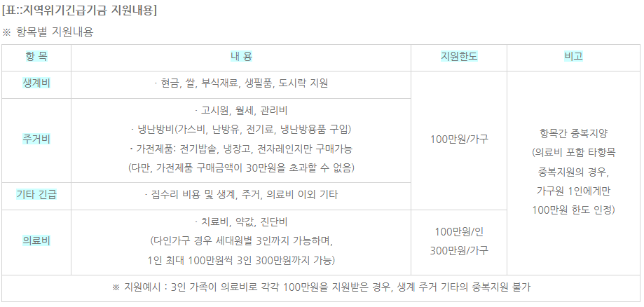 | ▶ 주소득자의 사망, 가출, 행방불명, 구금시설에 수용으로 생계가 어려운 경우 ▶ 중한 질병 또는 부상을 당한 경우 ▶ 만성질환이지만 급성으로 수술 등 의료비가 과다하게 지출되는 경우 ▶ 가족구성원으로부터 방임, 유기, 학대, 가정폭력, 성폭력을 당한 경우 ▶ 풍수해, 화재, 보일러 동파, 고장 등으로 거주하는 주택에서 생활이 곤란한 경우 ▶ 주소득자와의 이혼 등의 사유로 생계가 곤란하게 된 경우 ▶ 실직, 사업실패 등으로 소득을 상실하여 생계가 곤란하게 된 경우 ▶ 기타 중위소득 120% 이하의 빈곤가구가 위기에 처할 우려가 있는 경우 |