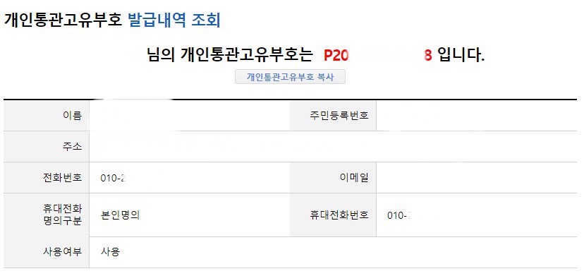개인정보 유출을 방지하기 위한 고유부호이므로 본인이 직접 공인인증서 및 휴대폰을 통해 본인 확인절차를 거쳐 신청해야 하며, 관세청 발급시스템에서 공인인증서 및 휴대전화 문자메시지로 본인확인 절차를 거친 후 간단하게 발급받을 수 있습니다.
