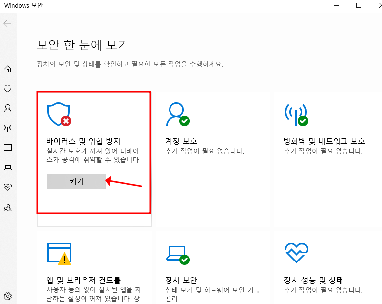 4. 바이러스 및 위협 방지에 '켜기'가 되어있다면 '끄기'로 고쳐주세요. 이제 끝입니다.