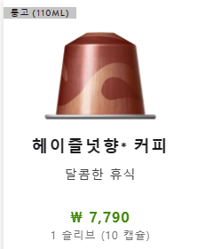 네스프레소의 가향커피입니다. 헤이즐넛향이 새로이 추가되었는데 각 커피 캡슐의 특징적인 향이 진하게 나기 때문에 커피 마시는 시간이 더욱 향기로워지는 걸 느낄 수 있을 거예요.