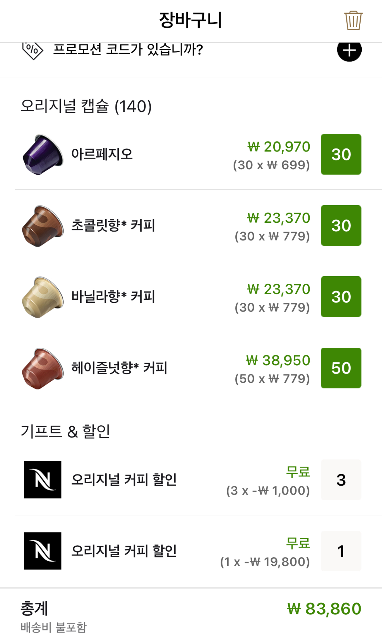 평소에 오리지널 캡슐을 사던 주문내역을 그대로 가져와서 이번 행사에 절약할 수 금액을 계산해봤는데 140 캡슐을 정상가 104,660원에서 20,800원을 할인받아서 결제금액 83,860원이 나옵니다. 굉장히 저렴하네요.