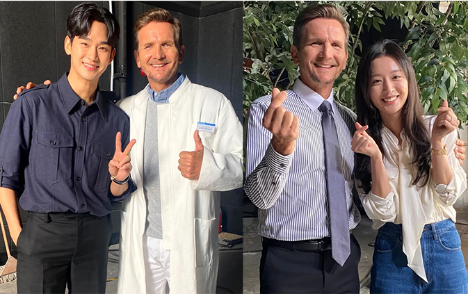 사진에는 로쉬가 '눈물의 여왕'의 주인공 김수현과 김지원과 애정어리게 포즈를 취하며 한국 스타일 하트를 만드는 모습이 담겨 있습니다.