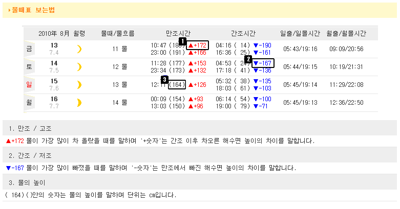 우리나라 3면의 바다는 각기 물때표가 다르답니다. 그러니 낚시나 해루질을 가기 전에는 물때표를 확인하는 습관을 가져서 좀 더 낚시에 성공할 확률을 높이는 것도 조사님들의 능력이 되지 않을까 합니다.