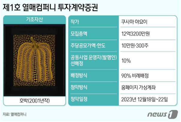 첫 번째 대상은 유명 작가 쿠사마 야요이의 작품 '호박'입니다. 이 작품을 통해 12억3200만원의 공모가 진행될 예정이며 내년 초에 유통이 시작될 것으로 예상됩니다. 또한, 예상에 따르면 연내에 더 많은 조각투자 상품이 등장할 것으로 전망됩니다. 현재 다른 기업들도 증권신고서를 제출하여 새로운 투자 상품을 발표할 예정입니다.