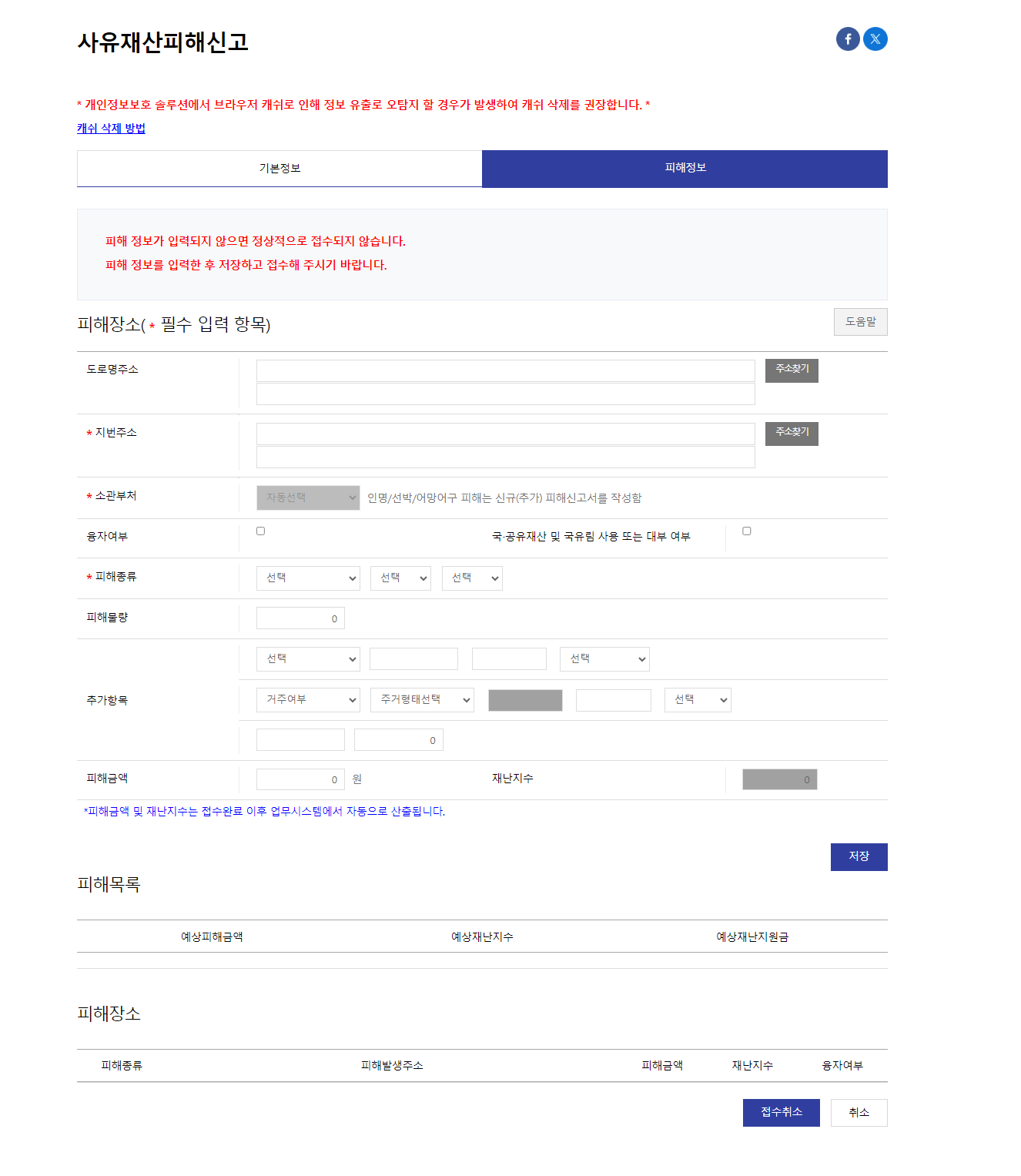 피해를 입력한 후, 우측 하단의 접수 버튼을 누르셔야 피해 정보가 자치단체로 접수됩니다. 접수 버튼을 클릭하지 않으면 신고가 완료되지 않으니 주의해야 합니다.