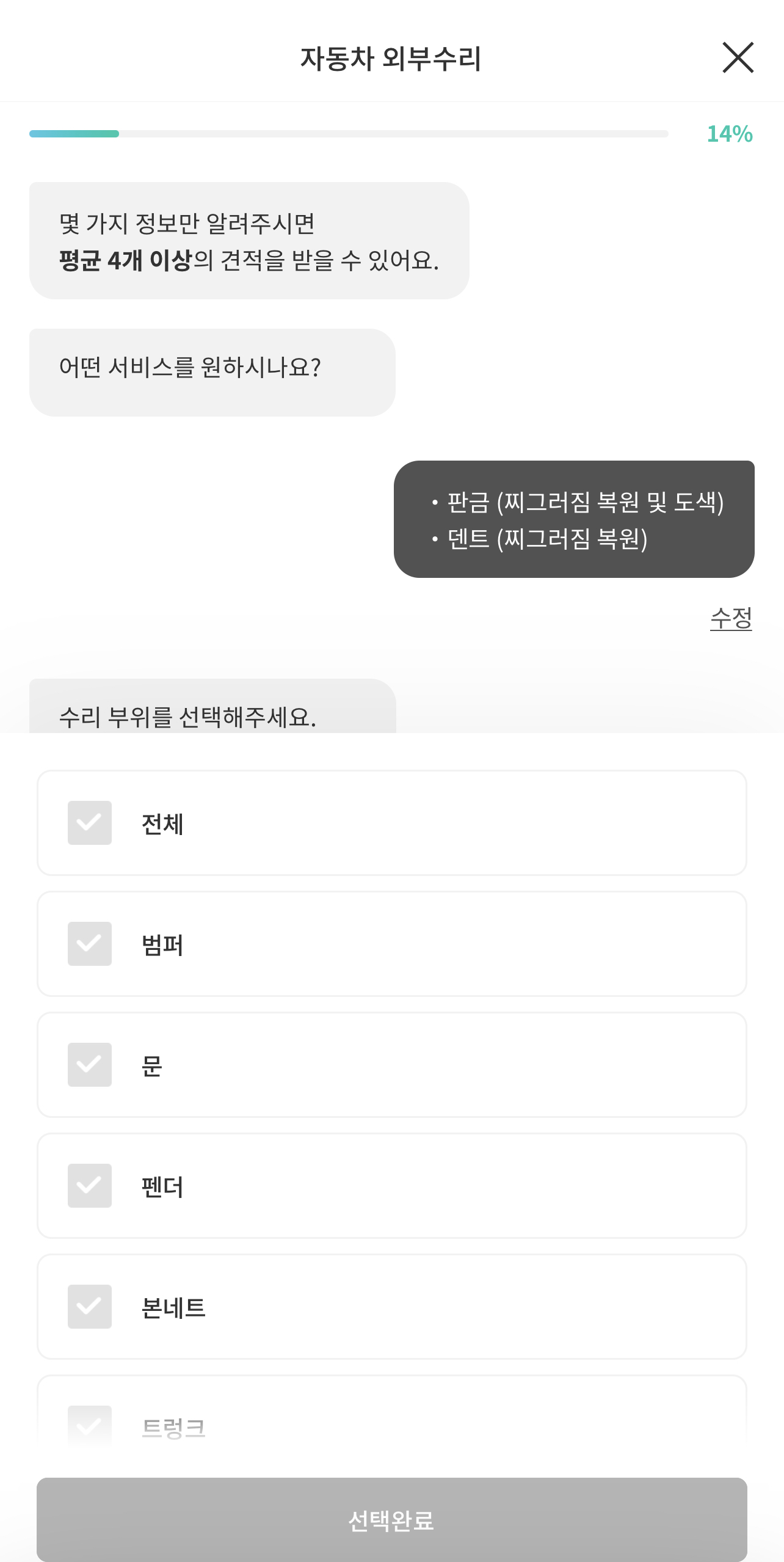 현재 수리를 원하는 내용을 간단하게 선택하고