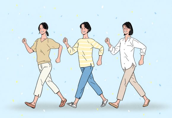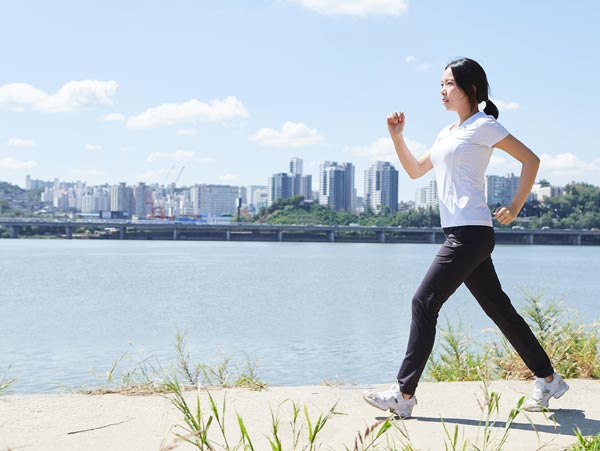 팔 : 팔이 옆구리에서 자연스럽게 흔들리도록 하고요. 팔을 90도 각도로 구부리고 보폭에 맞춰 앞뒤로 흔들리게 하면 운동효과가 더욱 좋습니다. 그렇지만 몸 앞에서 팔을 교차시키지는 말아주세요.