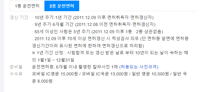 2종 면허의 경우, 2011년 12월 9일 이후에 취득한 면허는 10년 주기로 1회, 2011년 12월 8일 이전에 취득한 면허는 9년 주기로 2회 적성검사를 받아야 합니다. 65세 이상인 사람은 5년 주기로 1회 적성검사를 받아야 합니다. 70세 이상인 사람은 2011년 12월 9일 이후에 면허를 갱신한 경우 적성검사를 받아야 합니다.
