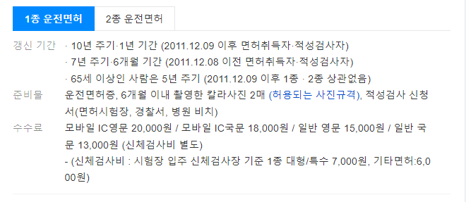 1종 면허의 경우, 2011년 12월 9일 이후에 취득한 면허는 10년 주기로 1회, 2011년 12월 8일 이전에 취득한 면허는 7년 주기로 2회 적성검사를 받아야 합니다. 65세 이상인 사람은 5년 주기로 1회 적성검사를 받아야 합니다.