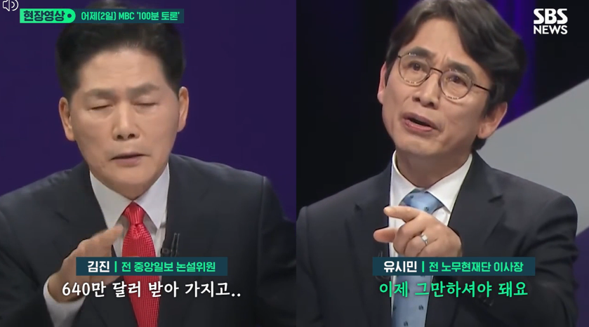 함께 패널로 출연한 유시민 전 노무현재단 이사장은 "그만하셔야 된다"며 "사실 관계에 대한 다툼으로 들어가면 토론이 산으로 간다", "최소한의 예의를 지키시라"고 충고했지만, 김 전 위원은 이에 아랑곳하지 않고 노무현 전 대통령 딸의 의혹까지 거론했습니다.