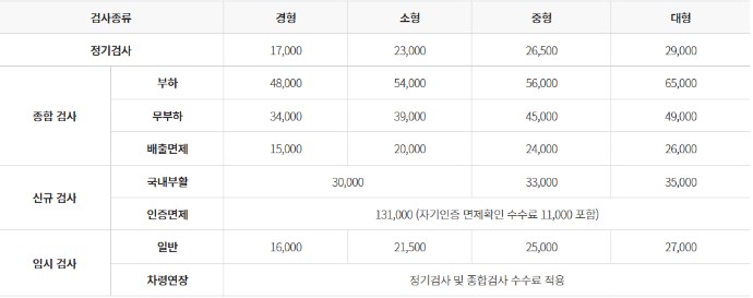 한국교통안전공단 내의 검사소에서 정기검사를 받게 될 때의 검사비용입니다. 민간정비소에서 받을 경우에는 금액이 달라질 수 있으니 참고 바랍니다.