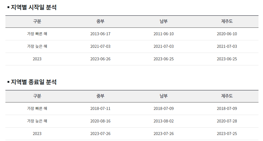 중부 지방의 경우, 6월 25일부터 7월 26일까지 장마가 지속되며, 남부 지방은 6월 23일부터 7월 24일까지 장마가 이어질 것으로 보입니다. 이렇게 지역별로 장마 시작 시기와 강수량에서 차이가 있다는 점을 참고하시기 바랍니다.