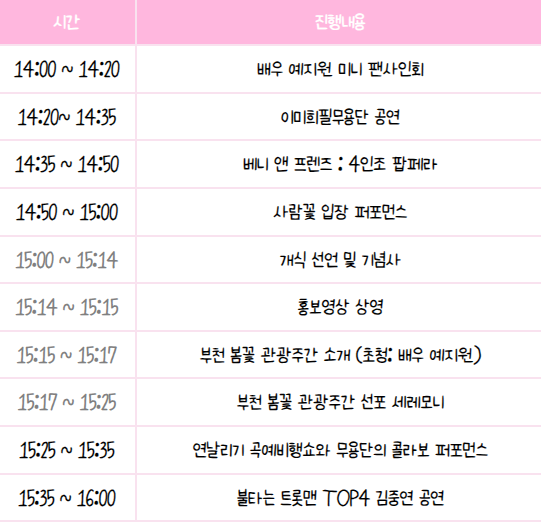 2024년 제24회 부천 원미산 진달래축제의 일정은 다음과 같습니다.