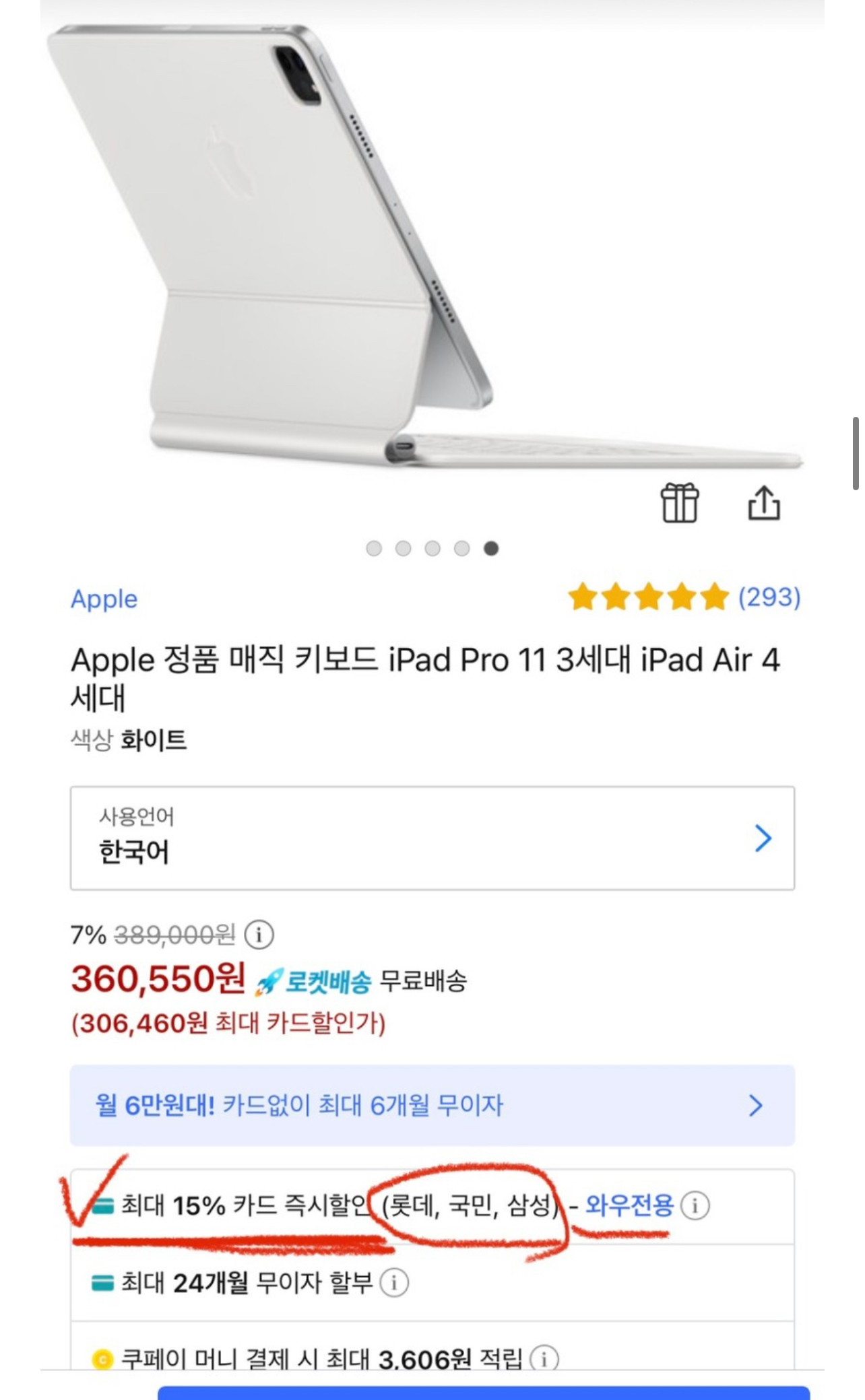 그렇게 해서 저는 최종적으로 389,000원의 애플 매직 키보드를 306,460원에 살 수 있었습니다. 정가보다 무려 21%, 82,540원을 더 싸게 살 수 있었죠.