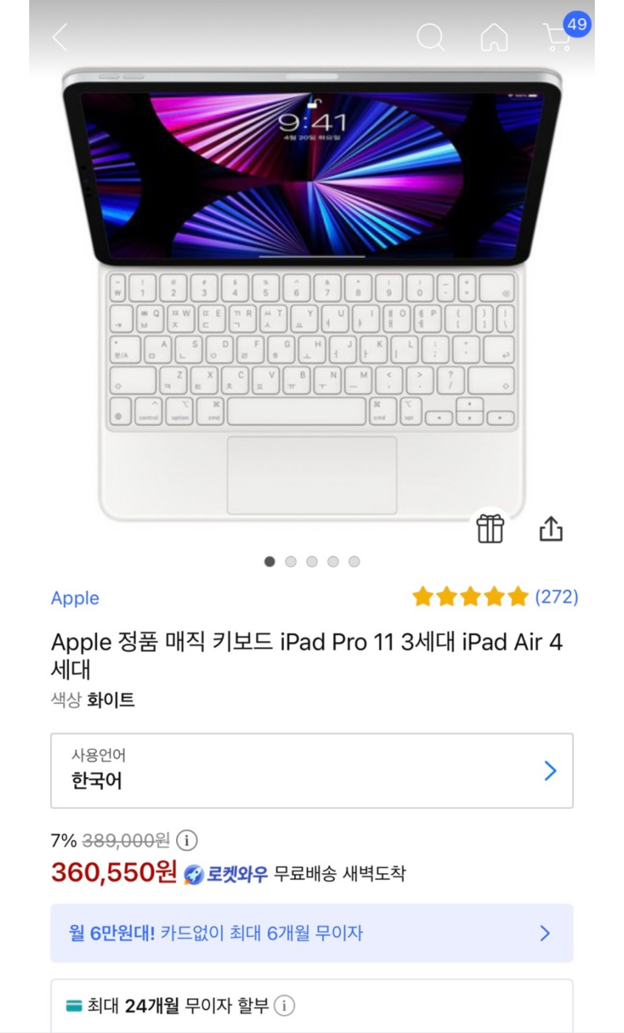 정가 389,000원이었던 매직 키보드입니다. 사고 싶어서 계속 쳐다봤는데 어느 날은 360,550원으로 3만 원 가까이 싸졌길래 장바구니에 담아놨습니다.