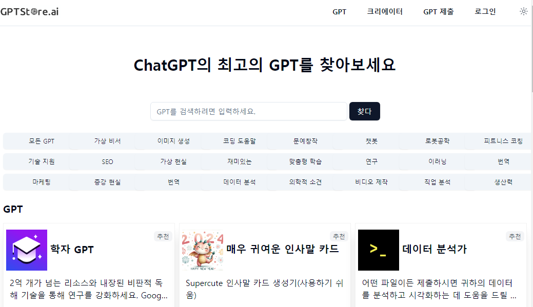 GPT스토어에는 이미 다양한 분야의 챗봇이 등록되어 있으며, 사용자의 요구에 맞는 챗봇을 선택할 수 있습니다.